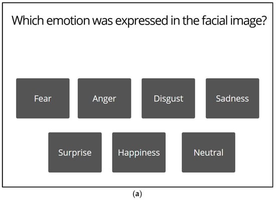 Facial stimuli used for the present study were selected from the National Institute of Advanced Industrial Science and Technology (AIST) facial expression database 2017 (). The database contains 12 types of emotional expressions from eight Japanese models (four men and four women), i.e., 10 types of expressions with closed mouths (i.e., anger, disgust, fear, happiness, sadness, surprise, sleepiness, excitement, relaxation, and neutral) and 2 types of expressions with open mouths (i.e., anger and disgust). The facial stimuli were provided free of charge, under the condition that they were used only for research purposes and were not disclosed to external parties. For the test sessions, we used a total of 56 stimuli with closed mouths, each of which expressed either neutral emotions or one of the six basic emotions designated by (), i.e., anger, disgust, fear, happiness, sadness, and surprise. For the practice session, we used eight stimuli with open mouths, all of which expressed anger, by selecting one stimulus from each model. All the selected stimuli were filmed from the front angle. Facial stimuli with a mask were virtually generated by superimposing an image of a nonwoven mask (Matsukiyo mimi ga itaku narinikui mask; Lib Laboratories Co., Ltd., Tokyo, Japan) over the lower half of the face by using Adobe Photoshop Elements 2019 (Adobe Inc., San Jose, CA, USA).