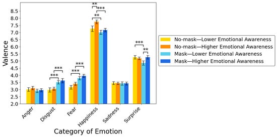 - Post-hoc multiple comparisons following simple interactions. Multiple comparisons further revealed that scores for valence were significantly lower in the mask than in the no-mask condition for disgust and fear stimuli in the groups with higher and lower emotional awareness (all ps < 0.001). In addition, scores for valence were significantly lower in the mask than in the no-mask condition for the happiness or surprise stimuli in the lower emotional awareness group, and for the happiness stimuli in the higher emotional awareness group (all ps < 0.001; Figure 4). Taken together, these results show that individuals with both low and high awareness of the link between interoception and emotion reported scores on valence that were closer to neutral for disgust, fear, and happiness stimuli in the mask than in the no-mask condition.