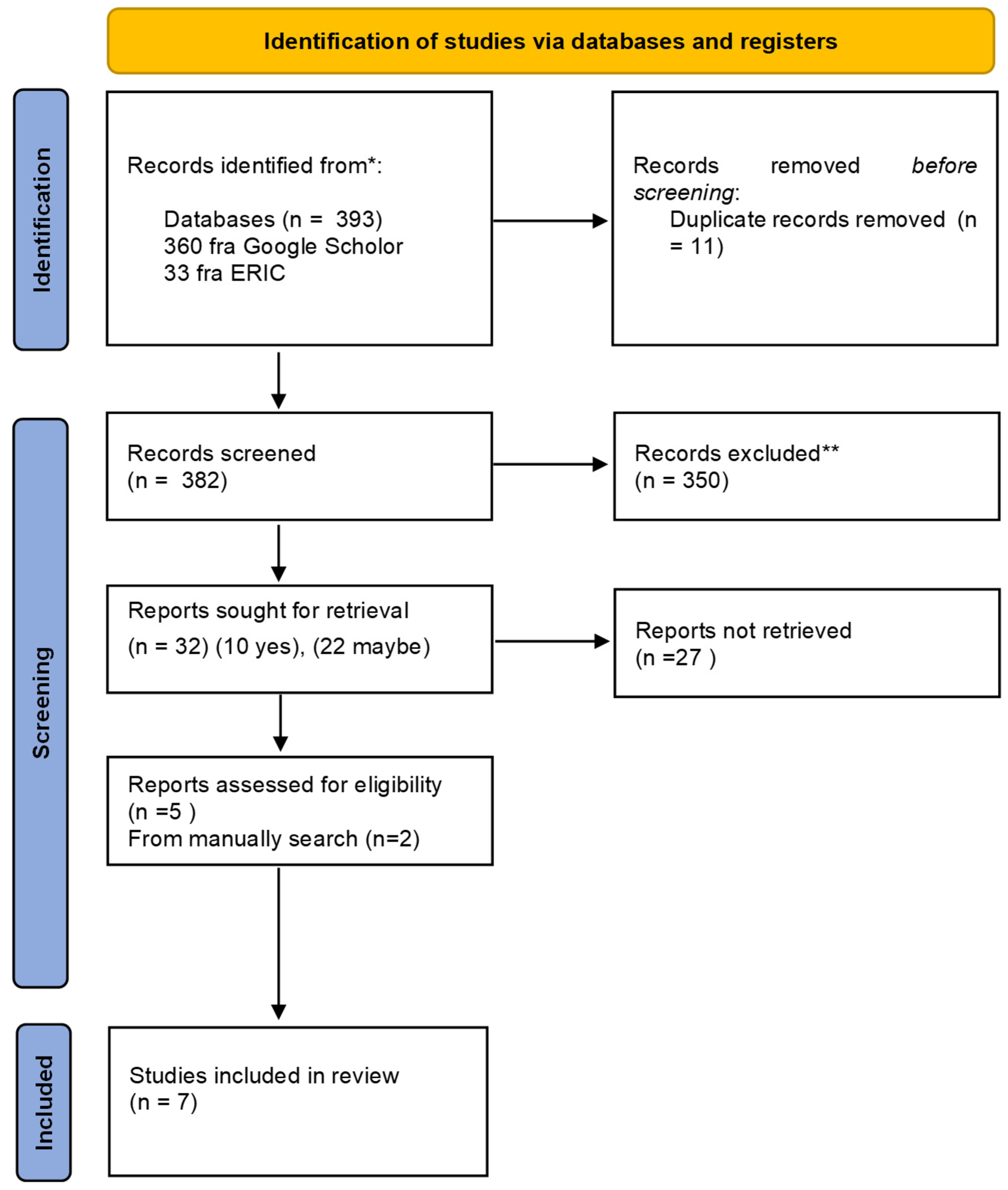 The search identified 393 records (360 from Google Scholar; 33 from ERIC). After removal of 11 duplicates, 382 records were screened (title/abstract), and 32 were retrieved for full-text review. Screening and full-text assessment were undertaken by a single selector. Of the 32 full texts, 5 met the inclusion criteria; 2 additional studies were identified through manual reference-list searches, yielding 7 included studies in total. The full selection pathway (including reasons for exclusion at full text) is shown in the PRISMA-ScR diagram and accompanying table in the thesis