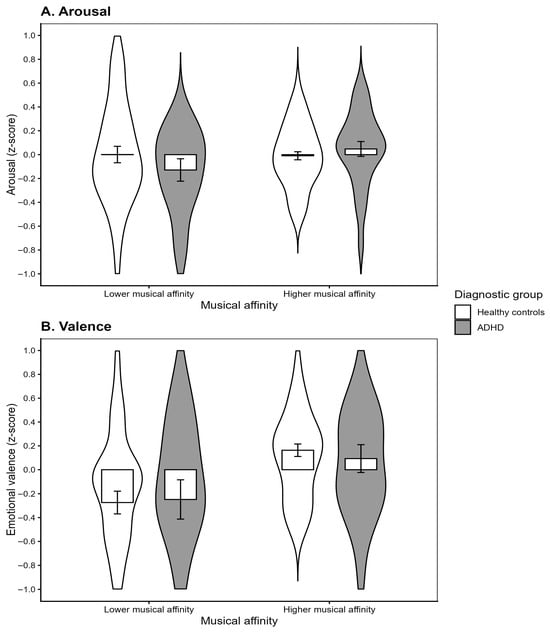 Mean and standard errors for (A) arousal and (B) emotional valence ratings as a function of musical affinity profiles and ADHD diagnosis.