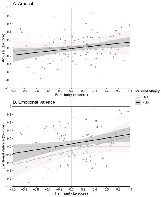 Effects of familiarity on (A) arousal and (B) emotional valence ratings by musical affinity profile.