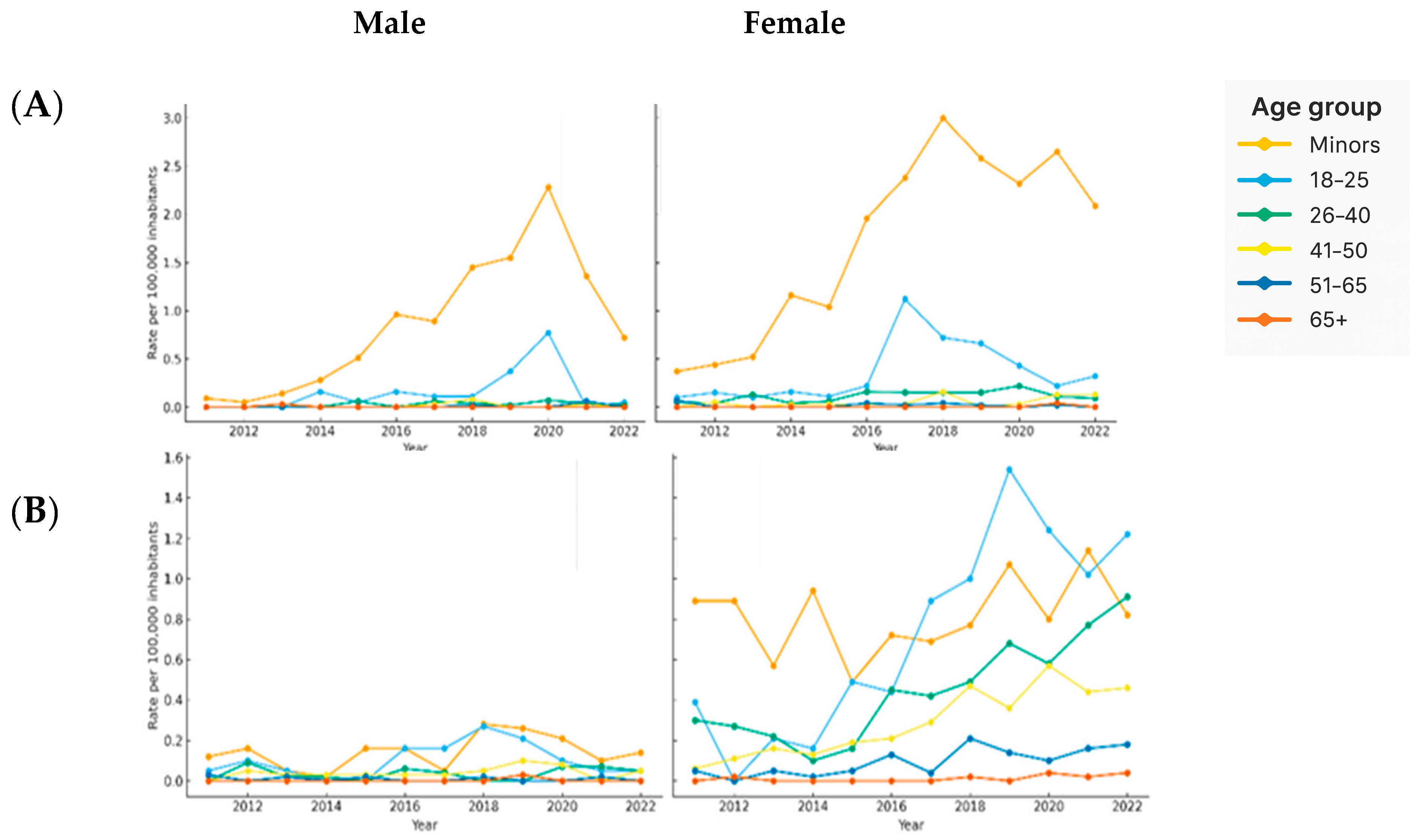 3.4. Evolution of Sexual Offense Rates in Spain by Age and Sex