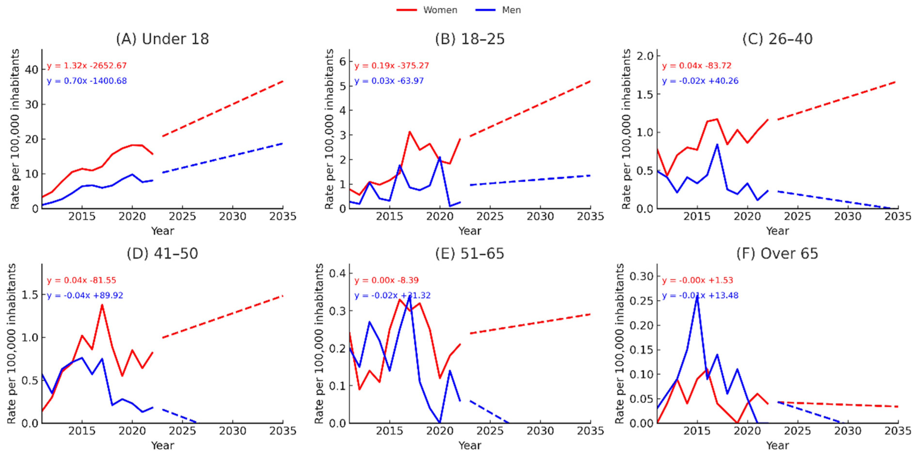 3.6. Projected Trends in Cybersexual Victimization Rates in Spain by Sex and Age Group (2011–2035)
