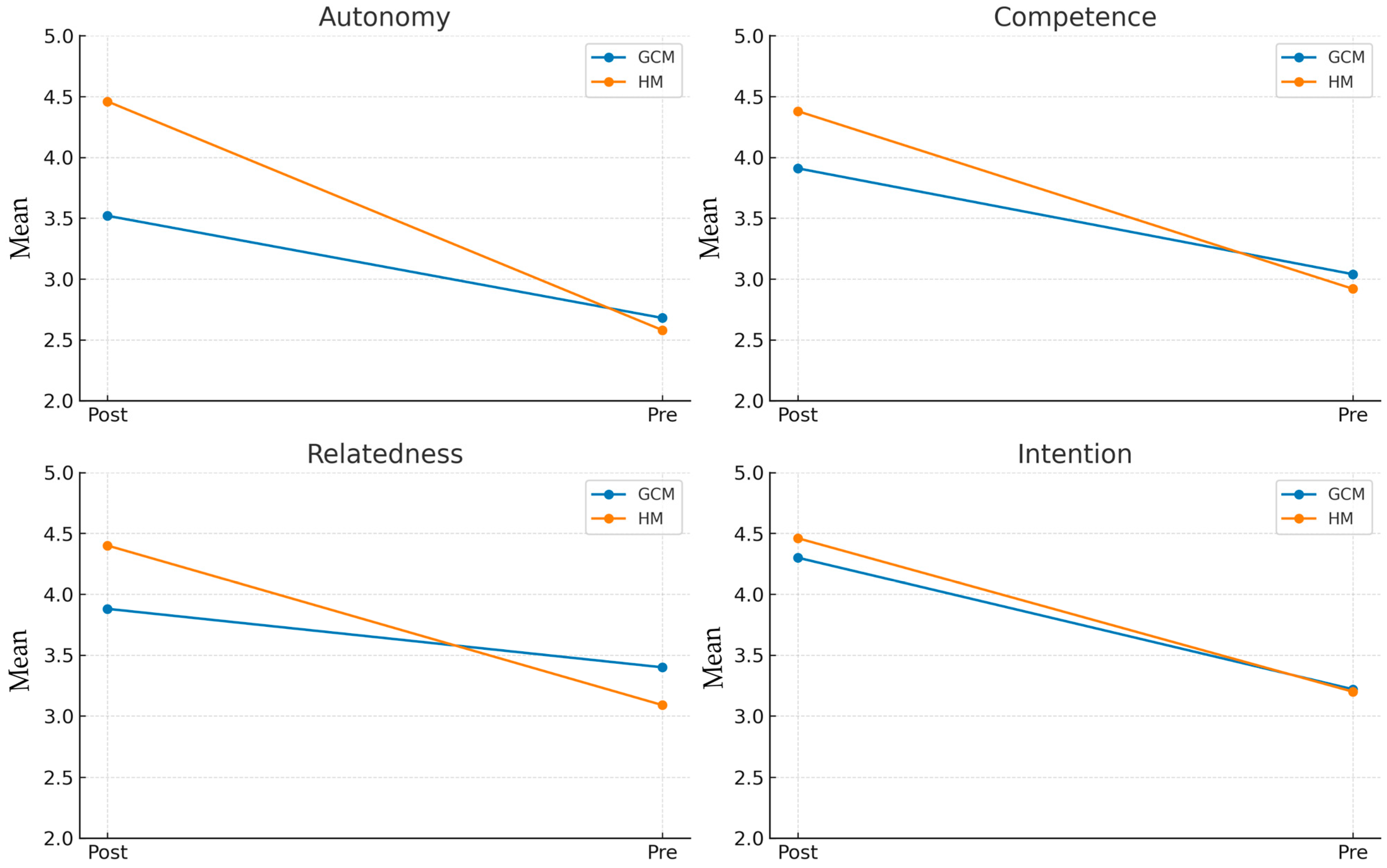| Intention | 6.27 | 0.013 * | 0.004 | 0.11 | PostGCM > PreHM; PreGCM < PostGCM; PreGCM < PostHM; PreHM < PostHM | GCM Pre: 3.22 [3.07, 3.36] HM Pre: 3.2 [3.05, 3.35] GCM Post: 4.3 [4.15, 4.44] HM Post: 4.46 [4.31, 4.61] |