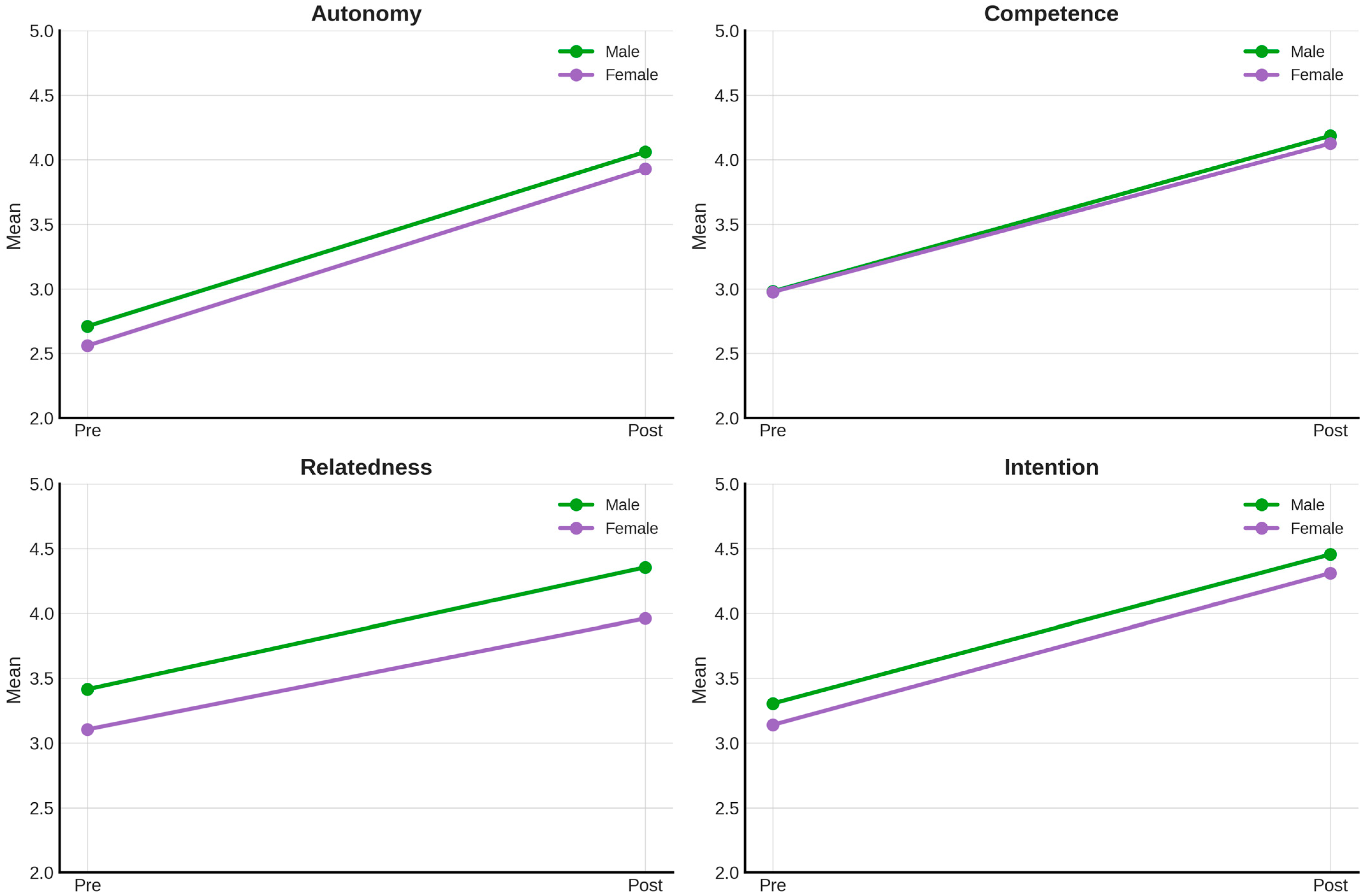 | Competence | 0.03 | 0.98 | 0.01 | 0.15 | Post M > Pre F; Pre F < Post F; Pre M < Post F; Pre M < Post M | M Pre: 2.99 [2.82, 3.17] F Pre: 2.97 [2.81, 3.13] M Post: 4.15 [3.97, 4.32] F Post: 4.13 [3.97, 4.29] | |