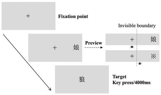 An invisible boundary was set between the fixation point and the preview character to ensure that the preview character remained at the intended parafoveal position. If the participant’s gaze crossed this boundary during the preview period, the preview character was replaced with the masking symbol (“※”). The experimental procedure is illustrated in Figure 1.