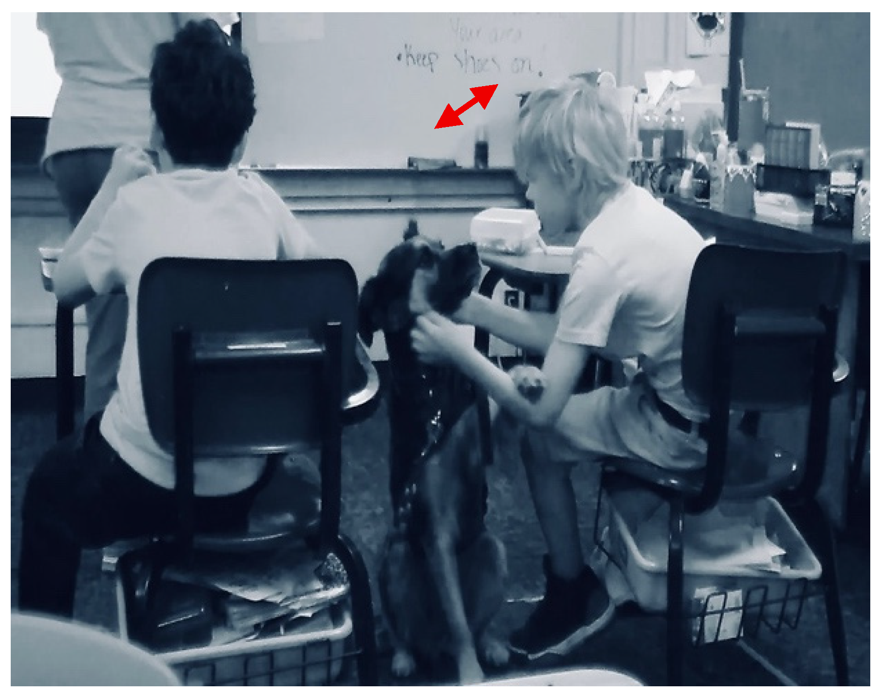 When he [student] gets upset, he kicks things, and he’ll hit himself or scratch himself…Muffin will just walk over and sit next to him. And one day, he was kicking his leg on his chair, and I was sitting here watching it because I was in a little bit of disbelief. She walked over, sat next to him for a minute, he kept kicking the chair. She actually put her head down where he was kicking, and I thought, “Okay, this is not, I don’t know about this.” And he’s very animal oriented himself. He’s one of the ones that was really looking forward to the dog. He stopped kicking, all of a sudden, his hand came down, he started petting her. It calmed the situation in less than a minute.