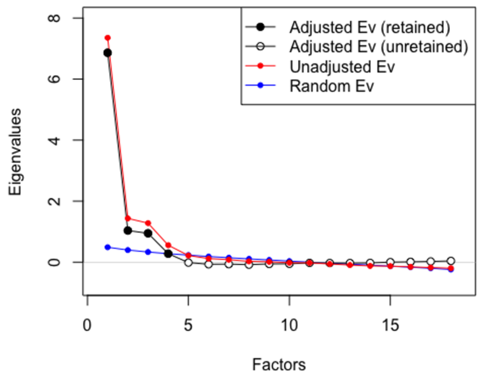 50. Zwick, W. R., & Velicer, W. F. (1986). Comparison of five rules for determining the number of components to retain. Psychological Bulletin, 99(3), 432–442. [Google Scholar] [CrossRef]