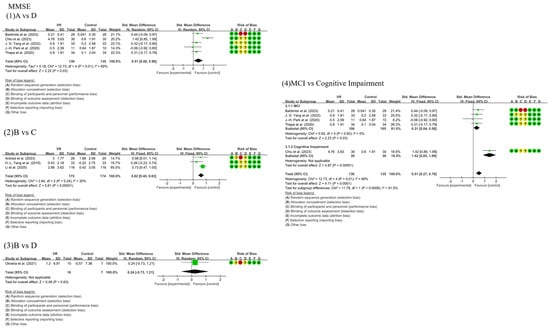 As shown in Figure 3, in conventional meta-analysis, the comparison between Group A and Group D (5 studies, n = 271) showed that fully immersive VR significantly improved MMSE scores compared to passive control (SMD = 0.51, 95% CI [0.06, 0.96], p = 0.03), with observed heterogeneity (I2 = 69%, p = 0.01). Sensitivity analysis excluding one outlier study (with severe baseline impairment) eliminated heterogeneity (I2 = 0%) while the effect size remained stable, confirming greater benefit for MCI participants. The comparison between Group B and Group C (3 studies, n = 349) showed partially immersive VR significantly outperformed active controls (SMD = 0.62, 95% CI [0.40, 0.83], p < 0.00001) with low heterogeneity (I2 = 30%). The single-study comparison between Group B and Group D did not reach significance (SMD = 0.24, 95% CI [−0.73, 1.21], p = 0.63).