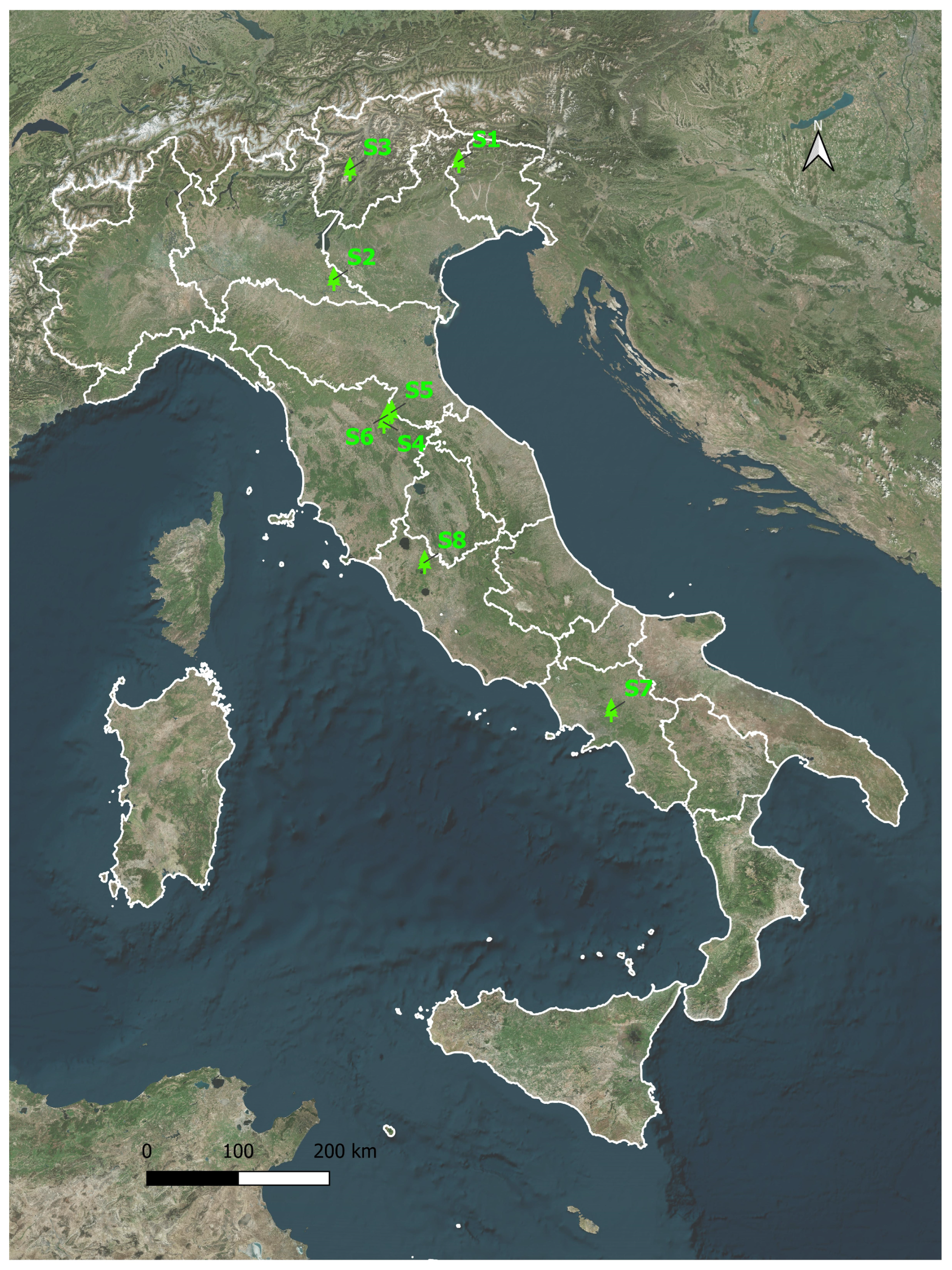 | S2 | Mincio Park b | 45.168 | 10.807 | 18 | 28 | 1570 | Willow; poplars; oak; turkey oak; alder | 18 September 2021 | 22 | 3 |