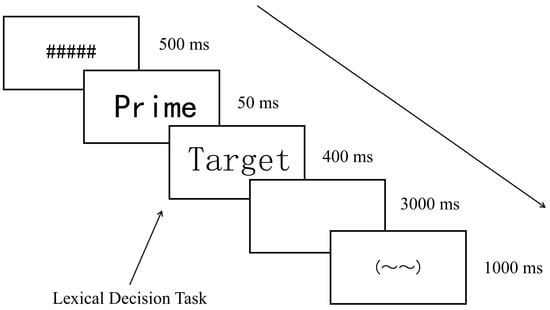 The visual lexical task was implemented in E-Prime 3.0 and presented on a CRT monitor with a 60 Hz refresh rate (see Figure 1). Each trial began with a 500 ms random-line mask, followed by a 50 ms prime (KaiTi font, size 46). The target word (SongTi font, size 48) then appeared for 400 ms. Participants were required to judge whether the target was a real word. Half of the participants pressed “Z” for real words, while the other half pressed “M.” After the response or after 3000 ms with no response, a 1000 ms fixation cross was presented as a rest cue. To minimize visual confounds, primes and targets were displayed in different font styles and sizes.