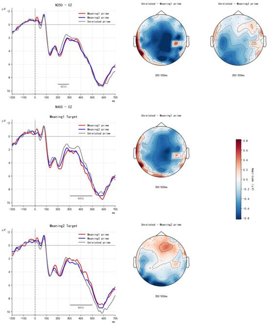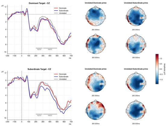 Grand-averaged waveforms of each condition for the dominant meaning target (upper panel) and subordinate meaning target (lower panel) at CZ and their corresponding difference topographic maps illustrating N250 and N400 effects.