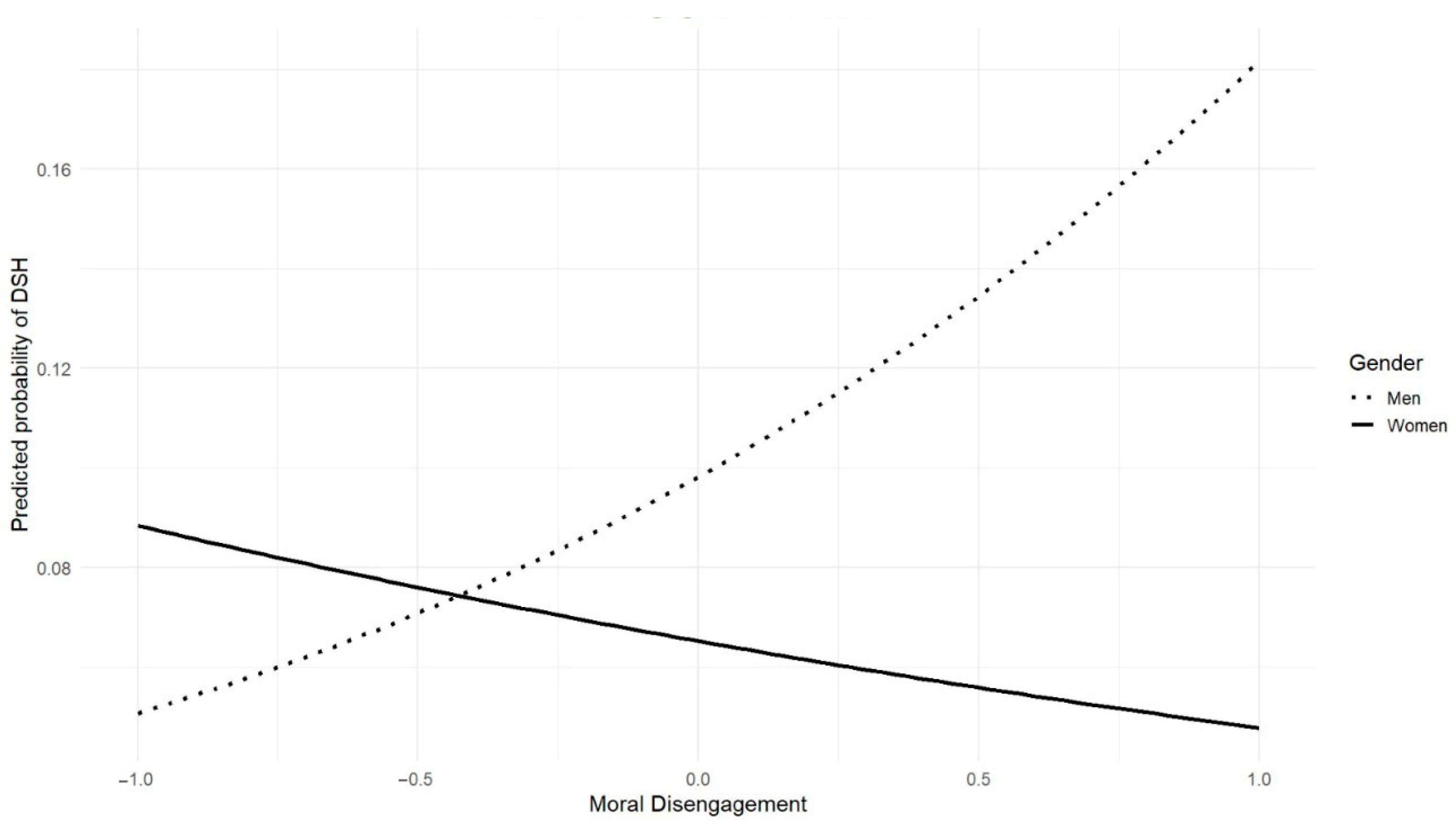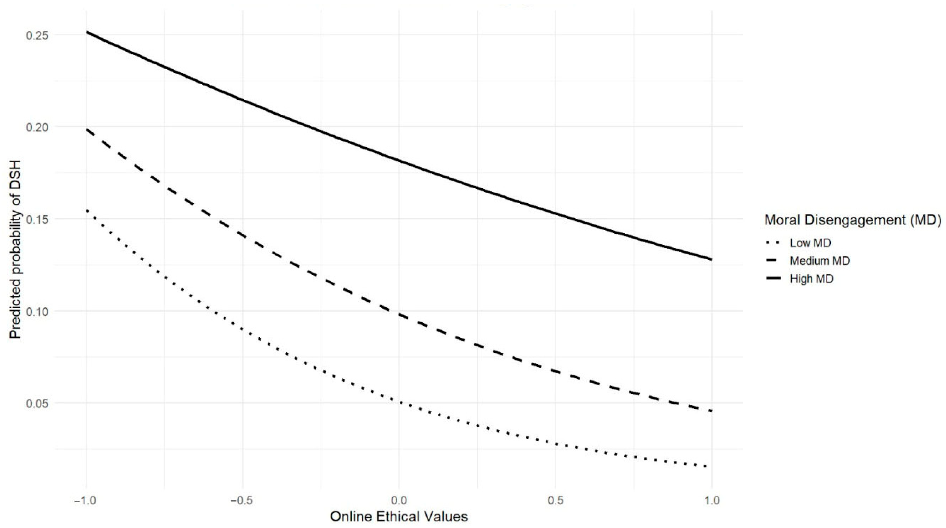 p < 0.05). The interaction revealed that the protective effect of ethical values against the perpetration of DSH was weaker at higher levels of moral disengagement. In other words, although higher online ethical values consistently reduce the likelihood of perpetration, individuals with elevated moral disengagement still present a greater overall probability of engaging in DSH compared to those with lower moral disengagement.