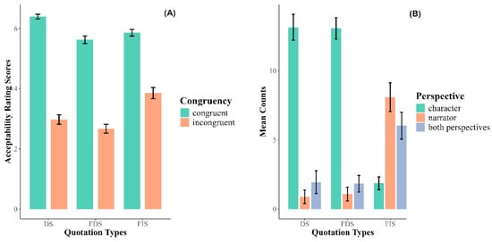 Descriptive statistics of two pre-tests. (A) The mean rates of acceptability judgment; (B) The counts of responses for the narrator’s perspective, the character’s perspective, and both perspectives. DS: direct speech; FDS: free direct speech; FIS: free indirect speech.
