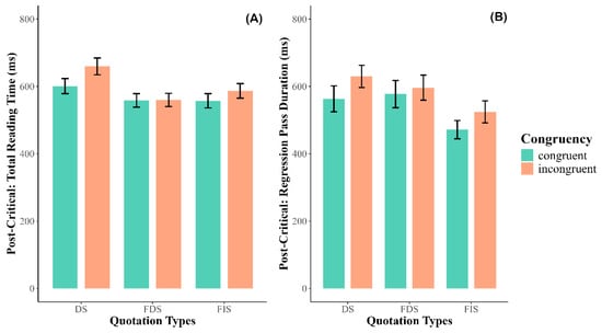 Results of the post-critical region. (A) Total Reading Time; (B) Regression Path Duration. DS: direct speech; FDS: free direct speech; FIS: free indirect speech.