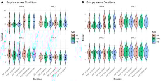 Beyond the eye-movement measures, we incorporated computational estimates of surprisal and entropy to gain deeper insight into the mechanisms of predictive processing. Surprisal, defined as the negative log-probability of a word given its preceding context, indexes the degree of unexpectedness associated with linguistic input (; ). Entropy, in contrast, captures the distributional uncertainty across all possible continuations, reflecting how strongly the context constrains upcoming words (). Together, these measures provide a principled way to characterize the predictability and complexity of linguistic environments (; ; ). The distinction between surprisal and entropy is important: surprisal quantifies the unexpectedness of the actually observed token, while entropy quantifies uncertainty over all possible next tokens. A manipulation can increase entropy by broadening the distribution of plausible continuations even when the eventual continuation is not extremely surprising.