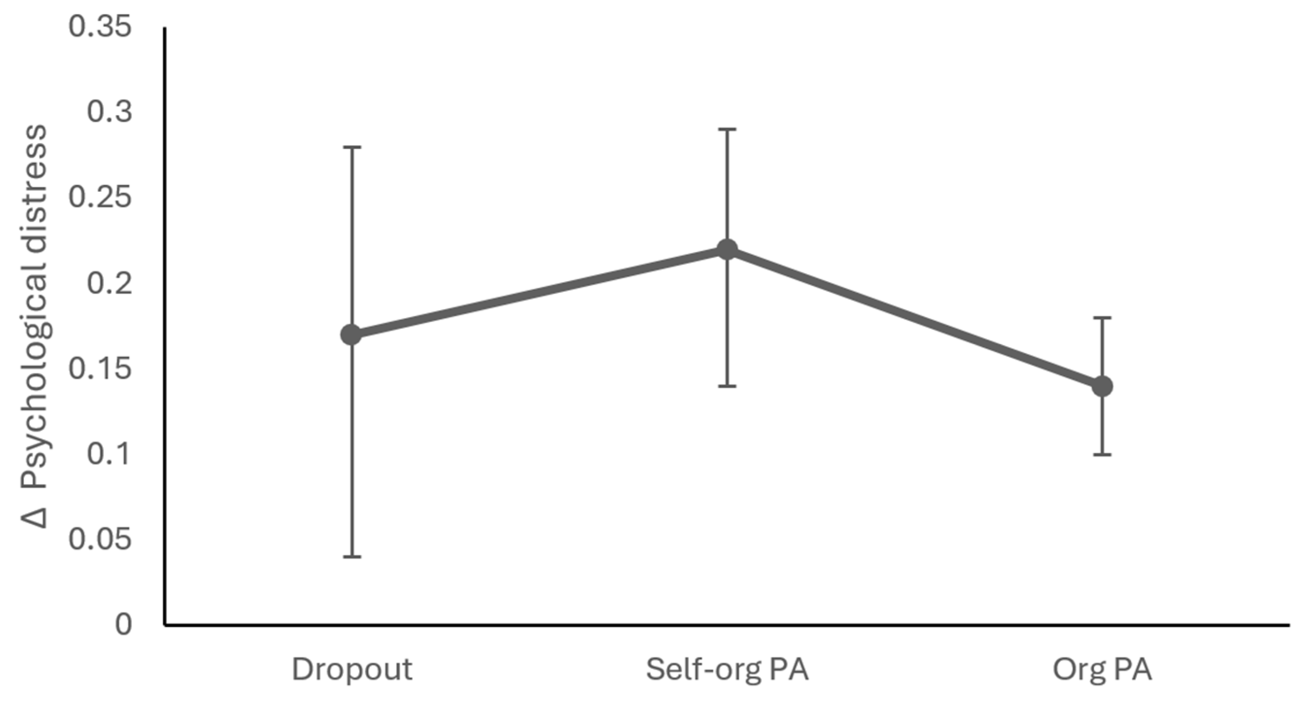 | 2. Distress Symptoms T2 | 1.64 (0.67) | 1.72 (0.73) | 1.79 (0.73) | 1.56 (0.62) | 0.33 * | 0.54 * | −0.13 * | −0.22 * | ||