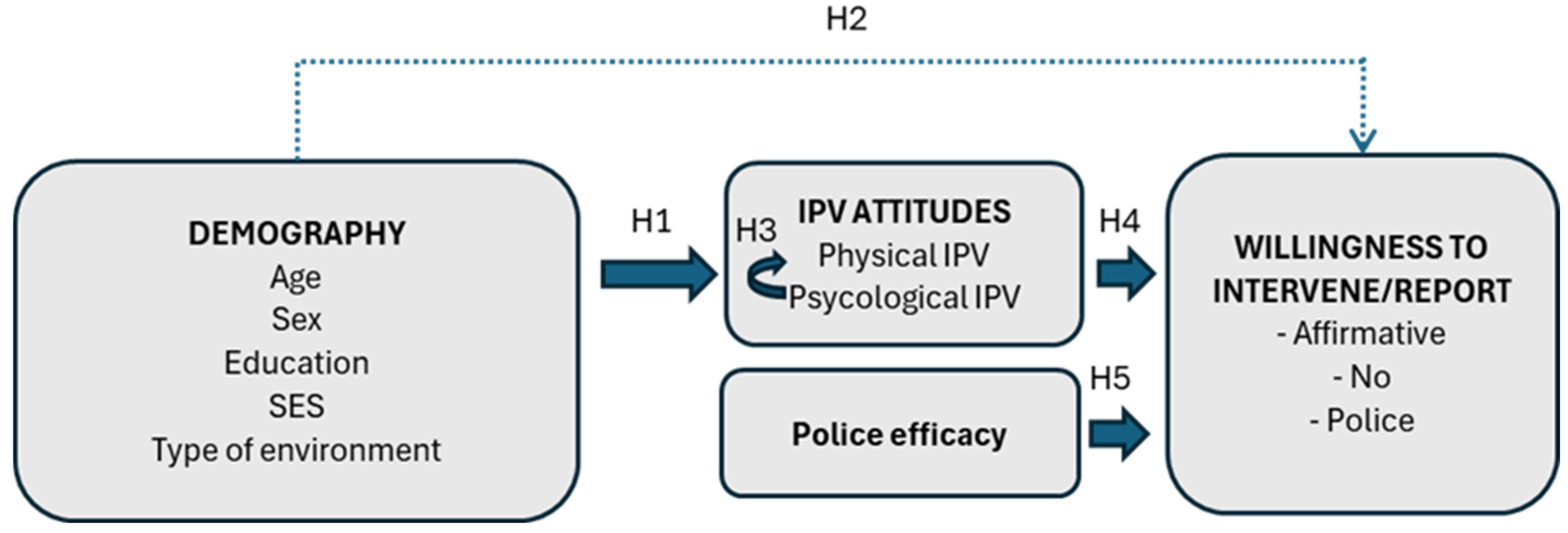 - Gracia, E., Martín-Fernández, M., Marco, M., Santirso, F. A., Vargas, V., & Lila, M. (2018). The willingness to intervene in cases of intimate partner violence against women (WI-IPVAW) Scale: Development and validation of the long and short versions. Frontiers in Psychology, 9, 1146. [Google Scholar] [CrossRef]