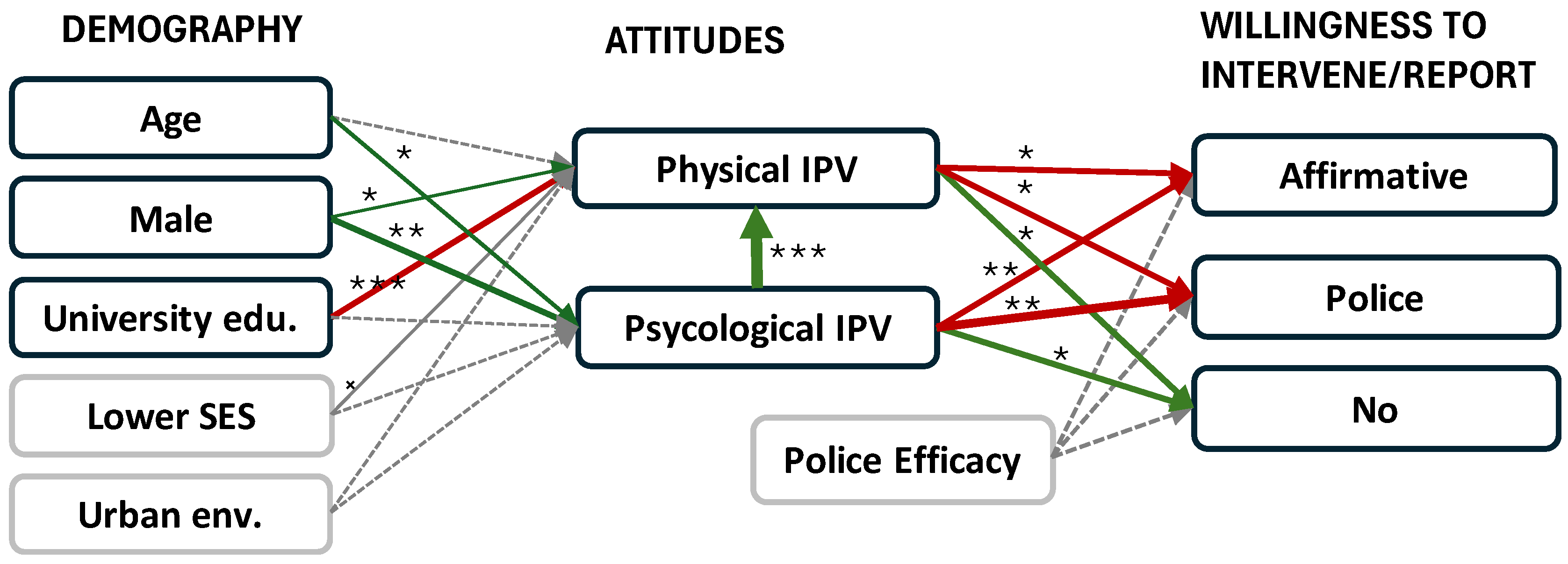 - Intervention threshold: his aspect was measured initially with three items: “An individual should contact the police if their partner threatens abuse,” “A man should be automatically arrested for any signs of abuse on a woman,” and “A woman should be automatically arrested for any signs of abuse on a man.” However, only the latter two items exhibited significant loadings on a unified factor. Since this content did not reflect a willingness to intervene but relatively strong views regarding formal consequences of IPV, we excluded this scale from our analysis.