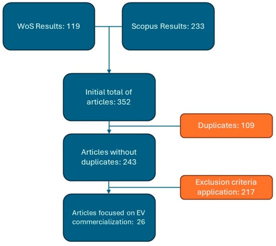 This second section presents a review of the academic literature on the particularities of electric vehicle (EV) marketing and sales. To ensure the review’s relevance and focus, a search strategy was implemented in Web of Science and Scopus, focusing on original articles, conference papers, and book chapters published in English since 2010. The selection was based on keywords related to commercialization, the sales process, and key factors for EV adoption, excluding studies focused on government incentive policies, technical or engineering aspects, and environmental impact. This approach allows for an in-depth analysis of the specific challenges and opportunities faced by vendors in this emerging market, offering a focused perspective on commercial and consumer dynamics. The total number of articles analyzed is provided in Appendix A.2 of this article.