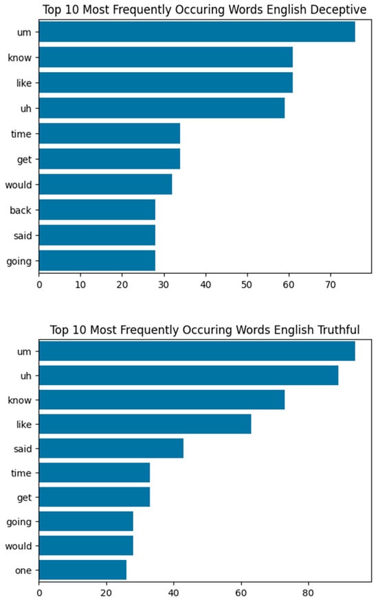 Figure 9 highlights the top words in deceptive and truthful categories. Though ‘po’, ‘yung’, ‘uh’, and ‘the’ appear in both, variations such as ‘nung’ and ‘yun’ in truthful statements indicate subtle linguistic differences that the model may exploit. The Tagalog visual model performs impressively, with 96.43% accuracy and 97.78% in cross-validation—surpassing Spanish and nearly matching English. The dataset’s homogeneity helped the model generalize visual cues effectively, suggesting that video alone could suffice for courtroom deception detection in Tagalog-speaking contexts. Unexpectedly, the Tagalog audio model was the weakest performer when trained in a normal split but had similar performance to English at 79.95% balanced accuracy after cross-validation. While pitch is a key feature, the standard deviation for all deceptive pitch values was 58.06%, and 59.88% for truthful—higher than truthful in English and Spanish (~40–45%) and lower than deceptive (~73–102%, respectively). This variability likely stems from inconsistent speech patterns and code-switching. Mixed-language sentences have different pitch contours and accents, complicating the model’s ability to distinguish deceptive behavior. Looking at the standard deviations of the other two languages in the deceptive and truthful categories shows a significant range between the two categories. The difference is clear. Unlike the other two languages, the audio model is not prepared for a bilingual speech pattern. Shen et al. also highlights how code switching has been difficult for speech recognition since many systems are trained on monolingual datasets. Shen et al. also stated that training on a bilingual or multilingual dataset should include preparation regarding how the acoustics and speech patterns are processed before training, suggesting that other researchers have combined models that were trained on monolingual datasets (