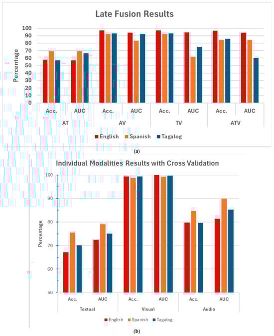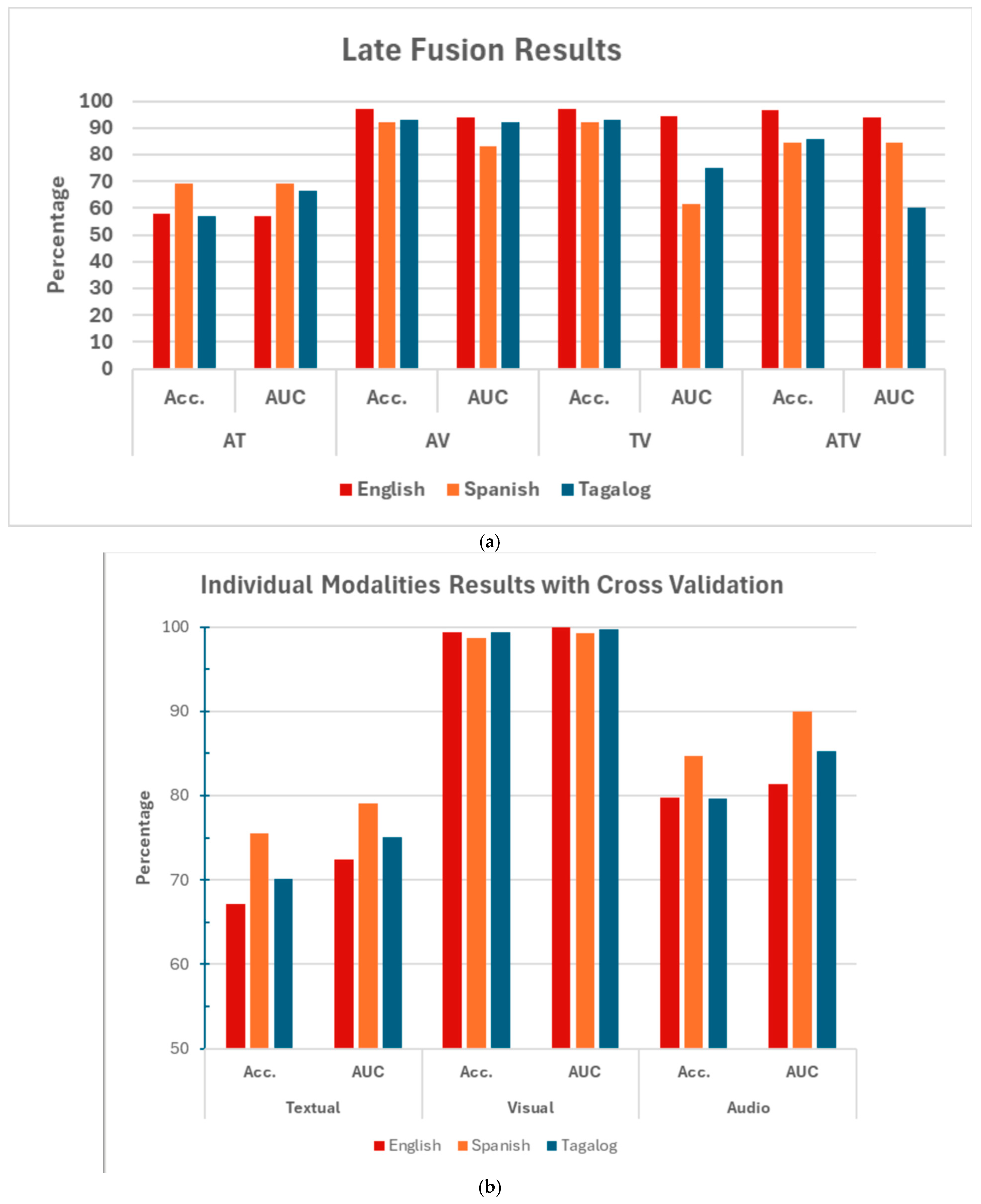 Figure 10 summarizes the classification performance of each individual modality—text, audio, and visual—across English, Spanish, and Tagalog datasets. Overall, visual models consistently achieved the highest accuracy across all three languages, demonstrating their reliability in deception detection. Textual models showed strong performance in Spanish and Tagalog, while English lagged slightly, possibly due to greater subject variability. Audio models were the least consistent, with Spanish performing best and Tagalog the weakest in a normal split but achieving better performance evaluation during cross-validation, likely due to pitch variability and language mixing. These results highlight the visual modality as the most robust across languages, while audio performance is more sensitive to linguistic and acoustic diversity.