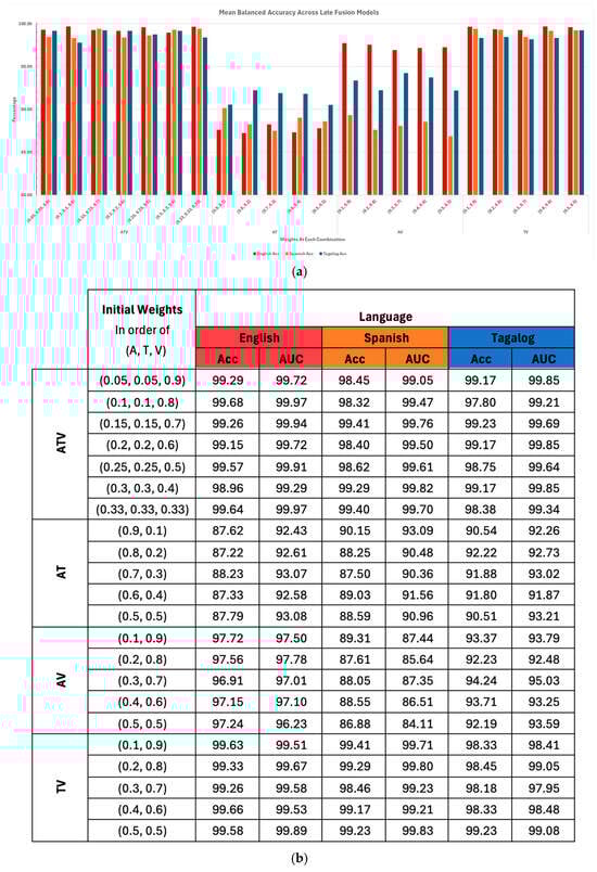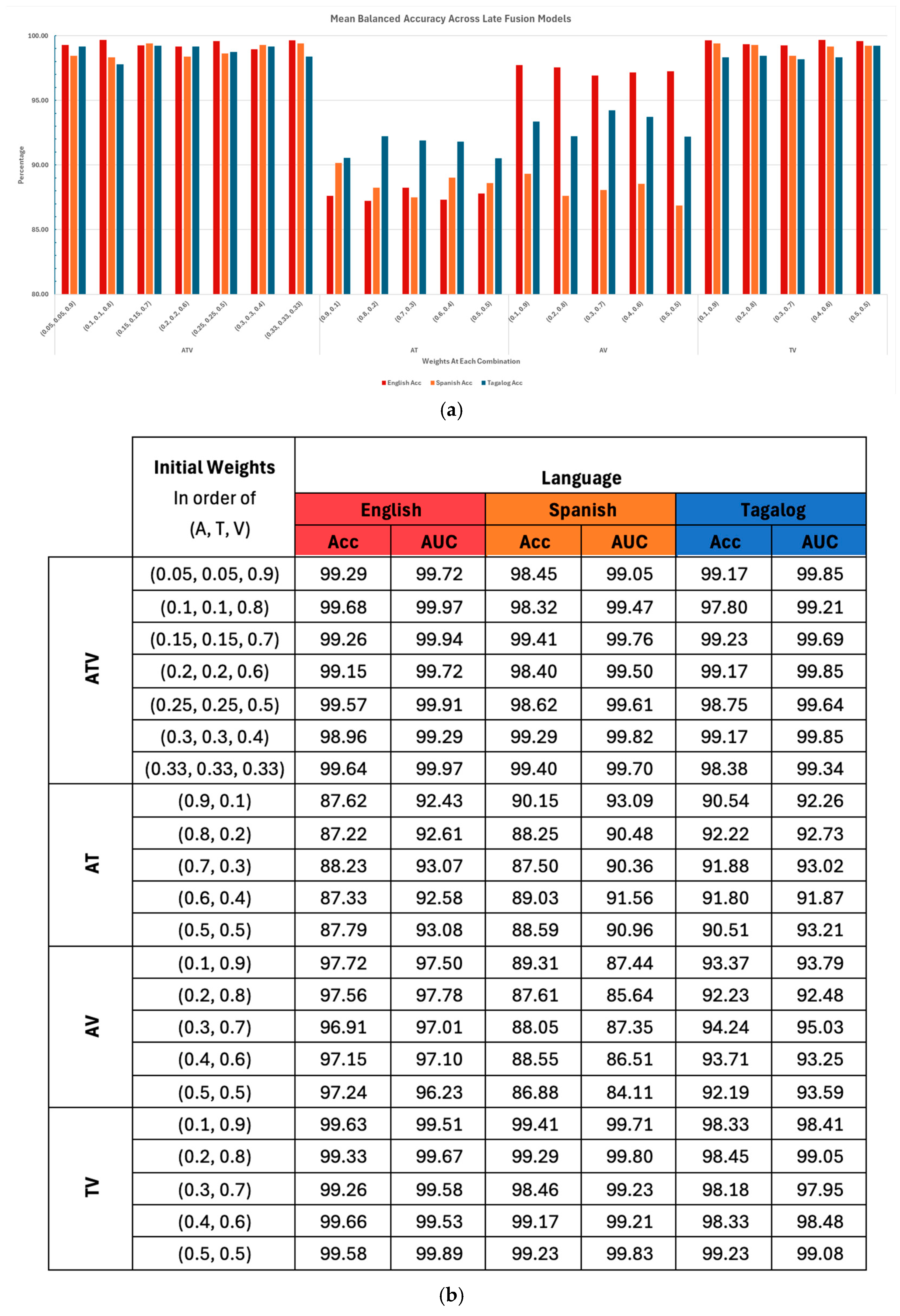 Figure 11 illustrates how accuracy shifts across different weight combinations for ATV, AT, AV, and TV models in English, Spanish, and Tagalog. The ATV and TV models consistently reached the highest accuracies, particularly in English, where performance remained near 100% regardless of weight distribution. On the other hand, the AT sub-model showed a clear drop across all languages, while the AV model displayed more variability. These patterns visually confirm that the visual modality is the most reliable contributor, with its presence driving high overall accuracy across languages.