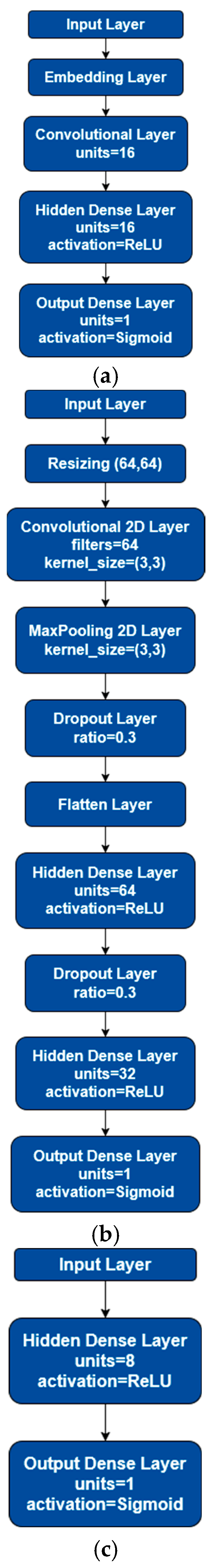 Figure 3a. For all three languages, the embedding dimension, CNN units, and dense units are 16. Additionally, the hidden dense layer uses the ReLU activation function, and the output dense layer uses the Sigmoid activation function. Although RNNs are usually used for text classification tasks,