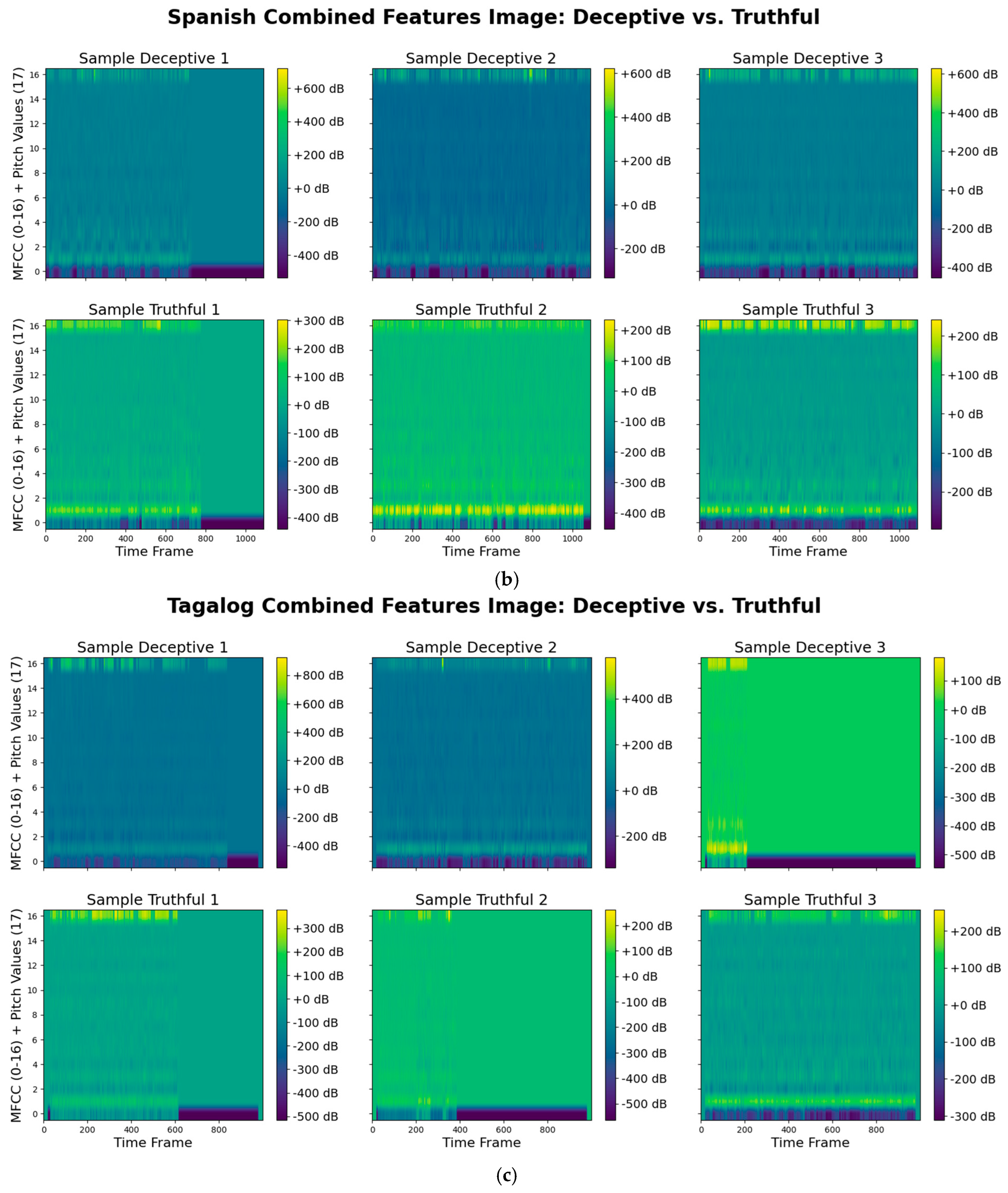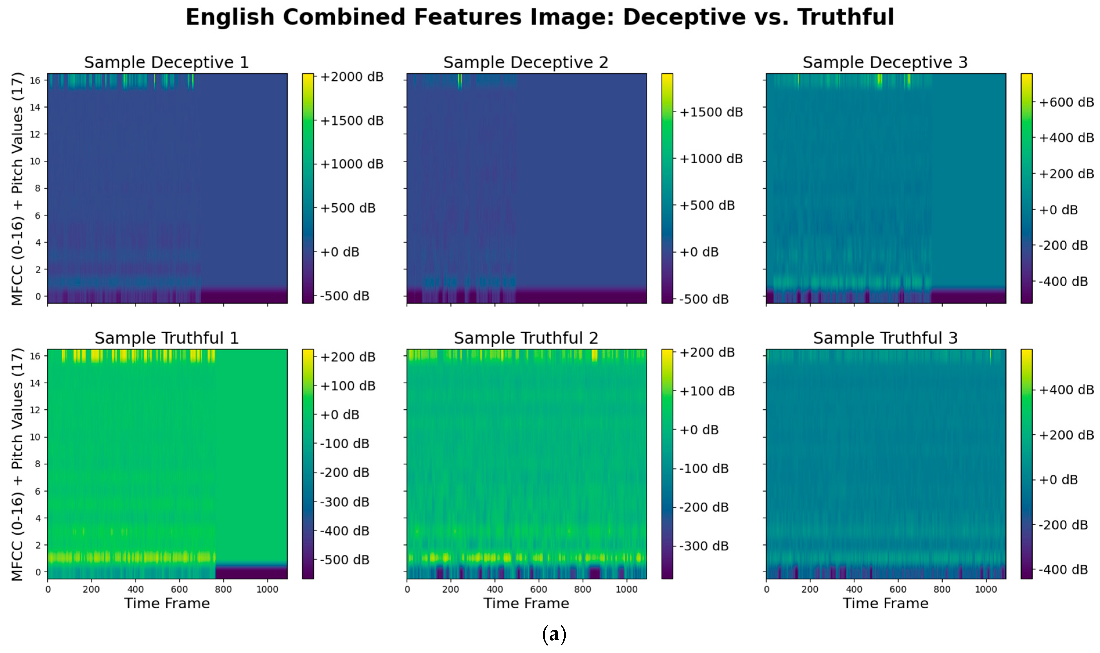 Tiwari, 2010), it offers valuable insight into both speaker identity and vocal variability under emotional or deceptive conditions. Pitch patterns often shift under stress or cognitive load, which are common during deceptive speech. MFCCs are a standard audio feature used in speech and speaker recognition. They approximate how humans perceive the spectral envelope of sounds and help distinguish subtle phonetic and prosodic differences across languages. While spectrograms and mel-spectrograms are also commonly used, our experiments confirmed that MFCCs consistently produced higher model accuracy and training stability when classifying deception. Additionally, MFCCs are sensitive to the articulation and rhythm changes that often accompany deceptive speech (