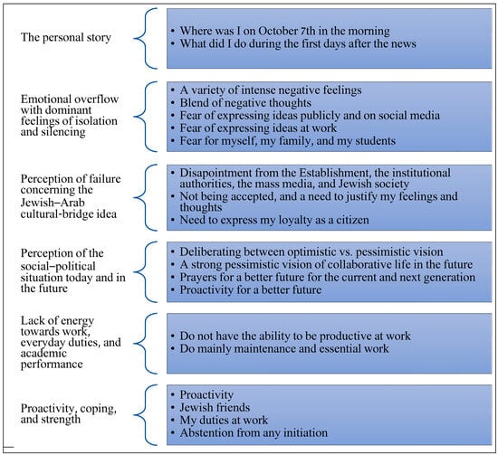 Data analysis revealed several main themes that emerged from the participants’ monologues. These themes were then grouped by both authors into six topics: (1) the personal story—how the events of October 7 affected them personally; (2) emotional overflow, including feelings of isolation and silencing, (3) critique/perception of failure regarding the Jewish–Arab cultural bridge idea, (4) perception of the social–political situation today and in the future, (5) lack of energy towards work, everyday duties, and academic performance, and (6) coping and strength resources (see Figure 1).