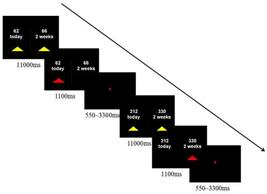 For the delay-discounting task, each participant made 40 binary, hypothetical choices between a smaller-sooner (SS) and a larger-later (LL) reward (Figure 1). The SS delays were “Today”, while the LL delays were “2 weeks”, “4 weeks”, or “6 weeks”. Reward amounts were adjusted so that the percentage difference, (LL − SS)/SS, varied across eight levels (1%, 3%, 5%, 10%, 15%, 25%, 35%, and 50%). The specific amounts in Renminbi (RMB), ranging from approximately ¥31.25 to ¥350, were derived by converting the original US dollar values from Kim et al. (2012) and halving them. Participants indicated their preference by pressing one of two buttons with their right hand as soon as the choice appeared. Decisions were self-paced, with a maximum allowed reaction time of 11,000 ms. A feedback screen displaying the chosen outcome was shown for 1100 ms, followed by a jittered inter-trial interval of 550–3300 ms. The entire task lasted approximately 7 min and was presented using the in vivo Esys system for fMRI (Gainesville, FL, USA).