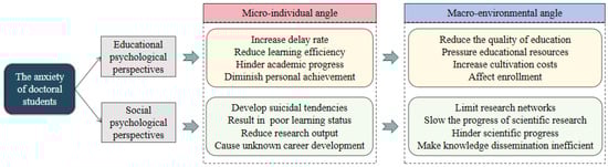 Based on the promotion of education and the rapid development of society, this study explores the importance of focusing on the anxiety experienced by in-school doctoral students. Utilizing a point-to-surface analytical approach, it comprehensively addresses the serious consequences related to their anxiety from both micro-individual and macro-environmental angles, as illustrated in Figure 2.