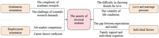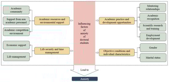 Building upon the open coding, axial coding was conducted to analyze the relationships between various conceptual categories. Similar concepts and threads were further summarized and merged to assign higher-level conceptual names that are more comprehensive. At this stage, four main categories were formed, further identifying the factors influencing the anxiety of doctoral students, as illustrated in Appendix B.