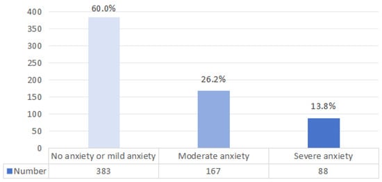As shown in Figure 6, 40% of doctoral students exhibit a relatively high level of anxiety (total score ≥ 10), with 167 students experiencing moderate anxiety (total score of 10–14), accounting for 26.2%, and 88 students experiencing severe anxiety (total score of 15–21), accounting for 13.8%. The highest anxiety score among doctoral students was 21, the lowest was 0, and the average score was 11.037. Regarding the overall status of anxiety among doctoral students, the phenomenon of anxiety is relatively common, consistent with the conclusions of (), which found that the most important factors contributing to the immense pressure on doctoral students are closely related to school and education. The uniqueness of doctoral education results in significant pressure on dissertation publication and employment, compounded by economic pressure and the uncertainty of returns on educational investment, leading to widespread anxiety among doctoral students in school.