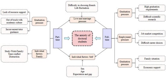 Firstly, we use a statistical analysis to present the basic situation of anxiety among doctoral students in the survey questionnaire, observe the perception of anxiety levels among doctoral students under different conditions through differential analysis, reveal the overall characteristics influencing doctoral students’ anxiety, and explore the evolutionary trends of their anxiety states. However, quantitative research examines the factors influencing doctoral students’ anxiety based on their basic conditions, without comprehensively considering the stimulating effects of their internal psychological conditions and external environmental conditions. It also fails to deeply explain the diverse influencing factors and mechanisms behind doctoral students’ anxiety from the perspective of individual doctoral students. To address these shortcomings, we follow the approach of “understanding the current status of anxiety—clarifying the influences of anxiety—investigating the causes of anxiety”, and further use in-depth interviews to flexibly obtain a large amount of intuitive information on the anxiety of doctoral students. We delve into their internal motivations and emotions and search for the deep-seated real and psychological factors behind their anxiety. We analyze the interview texts deeply using grounded theory, comprehensively organize, analyze, and summarize the data using NVivo14.0 software, use three-level coding to form abstract concepts from the interview content, systematically refine the core influencing factors of anxiety among doctoral students, and combine the interview texts to outline the influencing factor conceptual framework, as follows: