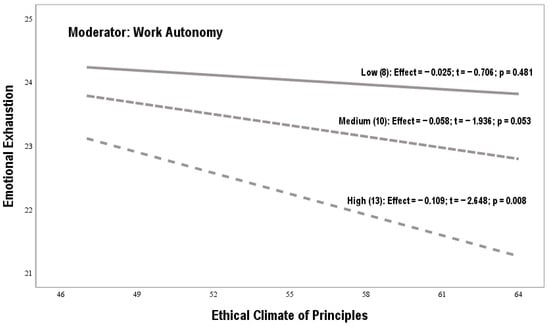 Figure 2 shows the moderating effect of work autonomy on the relationship between an ethical climate of principles and emotional exhaustion. The macro-PROCESS provides three independent values (low, medium, and high). The graph shows that low and medium autonomy levels were not statistically significant. In other words, these two autonomy levels did not influence the impact of an ethical climate of principles (X) on emotional exhaustion (Y). However, a high perception of autonomy changes the meaning of the relationship between X and Y. Therefore when an ethical climate of principles coexists with high autonomy, it has a buffering effect on emotional exhaustion.