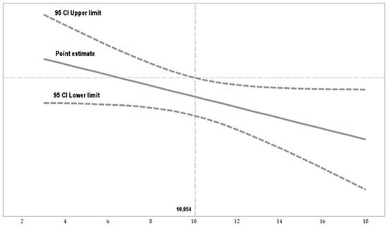 Figure 3 details the impact of an ethical climate of principles (X) on emotional exhaustion (Y), through the multiple moderating values assumed by work autonomy. Work autonomy changes the orientation of X over Y, starting from a value of 10.054. That is, the influence changes from negative to positive.