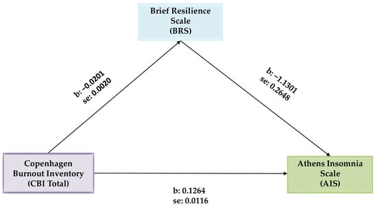 Mediation analysis of the Brief Resilience Scale (BRS) on the Copenhagen burnout inventory (CBI Total) and the Athens Insomnia Scale (AIS) relationship.