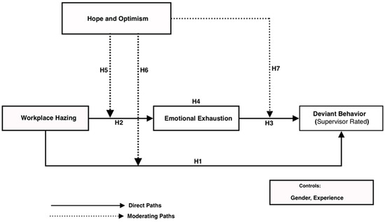 To mitigate the effects of workplace hazing, organizations can implement interventions that foster hope and optimism among employees. Supportive leadership. Leaders can promote a positive work environment by recognizing and reinforcing hopeful and optimistic behaviors (Khliefat et al., 2021). Training programs. Offering training that focuses on building psychological capital can help employees develop resilience, hope, and optimism. Mentorship and support networks. Establishing mentorship programs and support networks can provide employees with the resources and encouragement they need to cope with stressors constructively. Employees who maintain an optimistic outlook are better equipped to handle stress, which, in turn, reinforces their positive mindset. This creates a feedback loop that enhances overall well-being and reduces the likelihood of deviant behaviors resulting from emotional exhaustion (Alwheshi et al., 2024; Jia et al., 2022). Therefore, this study hypothesizes that hope and optimism moderate the relationship between workplace hazing and emotional exhaustion. Drawing from the arguments presented, the study hypothesizes that