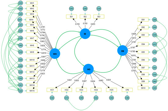 The respondents’ demographic information was tabulated using descriptive analysis. To analyze the link among WH, EE, HO, and DB, bivariate correlation was used. Before testing the proposed framework, the measurement model was examined using CFA.