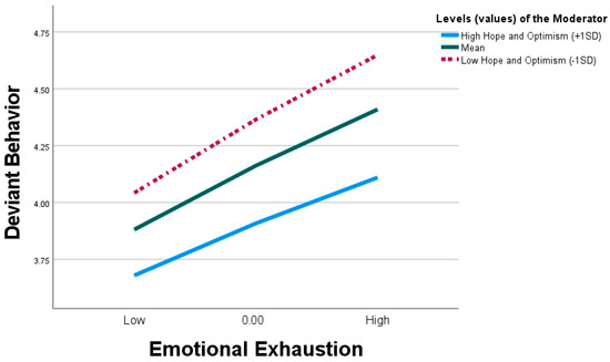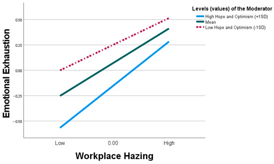Hope and optimism moderate the positive relationship between workplace hazing and emotional exhaustion, such that the positive relationship is weaker at a high level of hope and optimism.