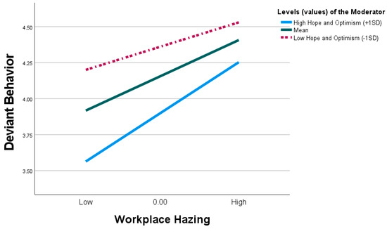 Hope and optimism moderate the positive relationship between workplace hazing and deviant behavior, such that the positive relationship is weaker at a high level of hope and optimism.