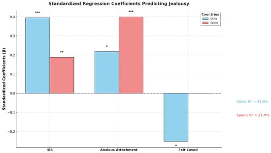 As can be seen in Figure 1, two additional stepwise regressions were run predicting jealousy by country. In Chile, 41.9% of the variance in jealousy (F3, 89 = 20.650, p < 001) was positively explained by IOS (β = 0.395. t = 4.433, p < 0.001) and anxious attachment (β = 0.218, t = 2.364, p < 0.05) and negatively predicted by felt loved (β = −0.251, t = −2.827, p < 0.05). In Spain, 21.9% of the variance in jealousy (F2, 165 = 23.157, p < 0.001) was predicted by anxious attachment (β = 0.400, t = 5.749, p < 0.001) and IOS (β = 0.188, t = 2.705, p < 0.01).