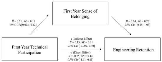 Mediation Model Between First Year Technical Participation and Retention Mediated via First Year Sense of Belonging. Next, we tested a simple mediation model looking at whether the relationship between first year technical participation and retention was mediated via first year sense of belonging using PROCESS macro version 4 (Hayes, 2013) with 5000 bootstrapped samples (see Figure 1 for full statistics), when controlling for Math ACT. No technical participation was the reference category. Although each path of the model was in the predicted direction, the overall indirect effect was non-significant. This could be due to a lack of statistical power due to only having retention and Math ACT data for 328 (of the total 589) participants. We ran a post hoc power analysis using a Monte-Carlo power analysis calculator (Schoemann et al., 2017), which indicated we only had 31% power to be able to detect this effect. However, it is also plausible that the lack of significance for the overall model means this effect is not robust or does not exist; future research should investigate this relationship further with larger longitudinal samples.