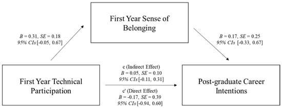 Figure 3. Mediation model showing the relationship between first year technical participation and post-graduate career intentions was not mediated via first year sense of belonging.