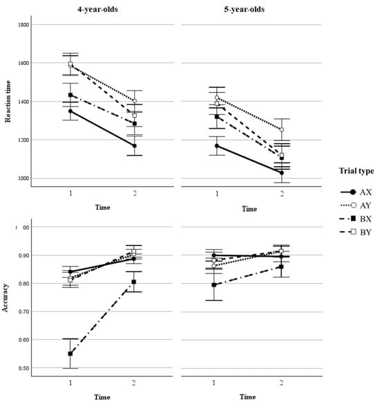 We first ran three-way repeated-measures ANOVA tests to evaluate the effects of age group (4-year-olds/5-year-olds), test session (T1/T2), and trial type (AX/AY/BX/BY) on reaction time and accuracy (cf. Figure 1).