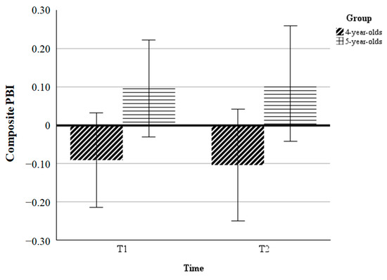 Composite PBI. To investigate the developmental transition from reactive to proactive control, we ran two two-way ANOVA tests using age group (4-year-olds/5-year-olds) as a between-subjects factor and test session (T1/T2) as a within-subject factor using the composite PBI as outcome measures. The effect size estimates are provided as partial eta-square (η2p) for the ANOVA tests and as Cohen’s d for paired comparisons (Cumming, 2012).