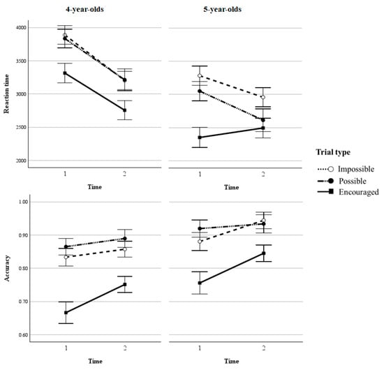 To analyze the CTS performance, we conducted similar 2 (age group: 4-year-olds/5-year-olds) × 2 (test session: T1/T2) × 3 (trial type: Proactive-Impossible/Possible/Encouraged) ANOVA tests for reaction time and accuracy (cf. Figure 3).