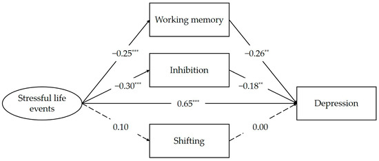 Executive functions mediated the correlation between stressful life events and depression. ** p < 0.01, *** p < 0.001.