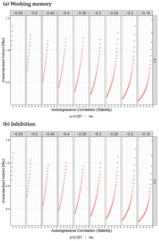 Sensitivity analysis plots for the mediating effects of (a) working memory and (b) inhibition, controlling for autoregressive and cross-lagged correlations. The maroon points indicate statistically significant estimates of the indirect effect.
